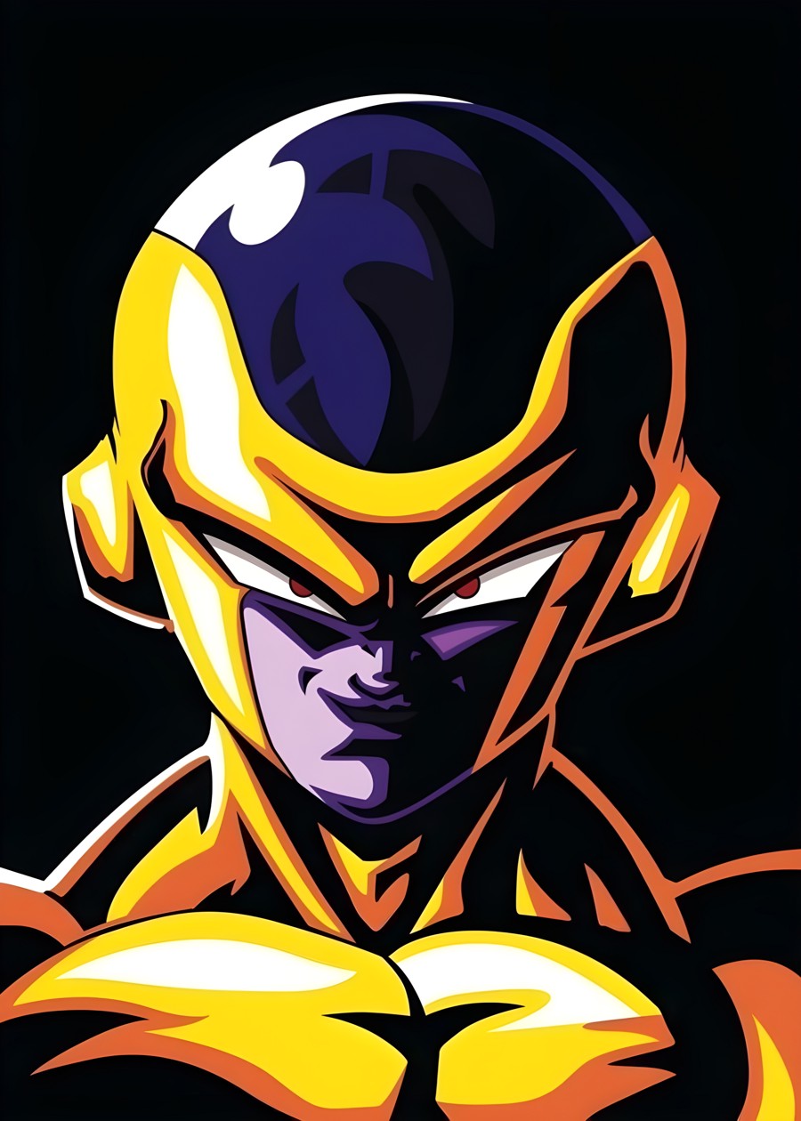 A stylized, pop-art-inspired portrait of Frieza in his Golden form from the Dragon Ball series.