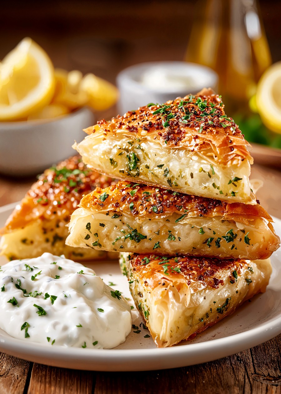 Crispy golden filo triangles filled with herbs and cheese, paired with creamy tzatziki. A deliciously rustic food art piece.
