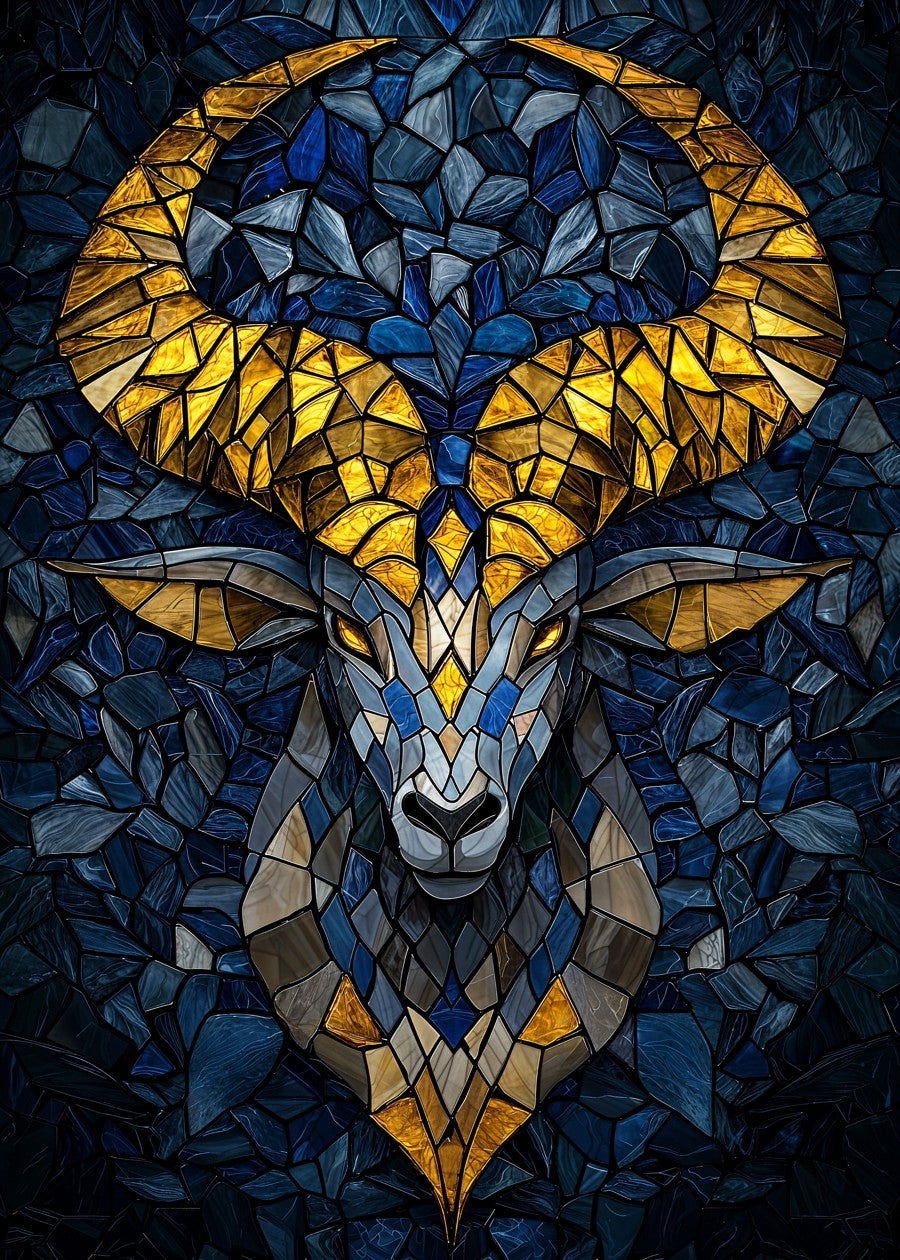 Striking stained glass artwork of a powerful ram with golden horns, crafted in rich blues and yellows for bold visual impact.