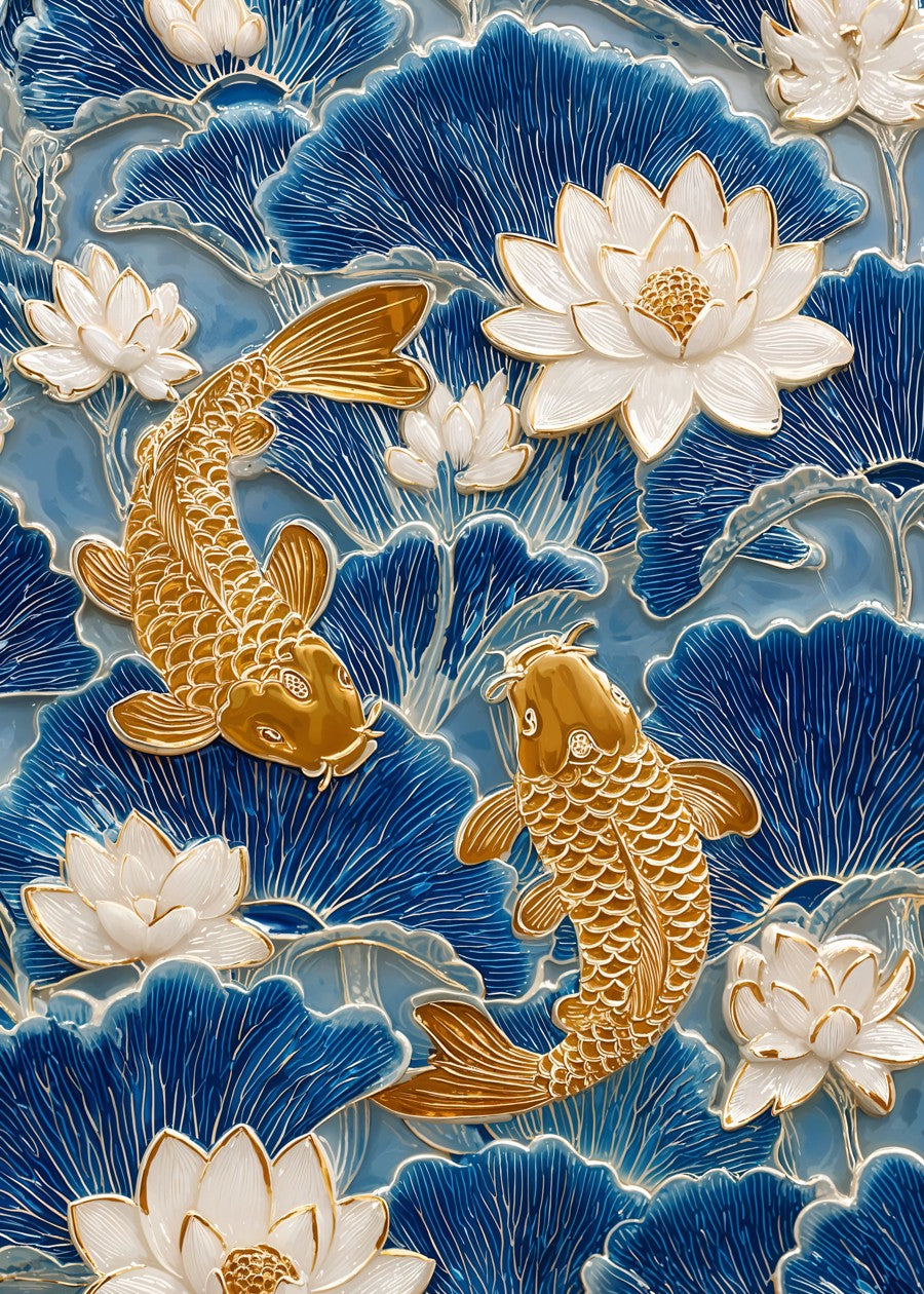 Elegant golden koi swim among white lotus flowers and rich blue leaves in this porcelain-inspired, peaceful nature artwork.