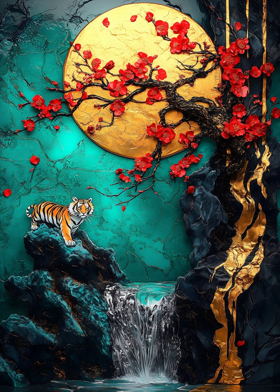 A tiger stands before a gold sun, entwined with cherry blossoms.