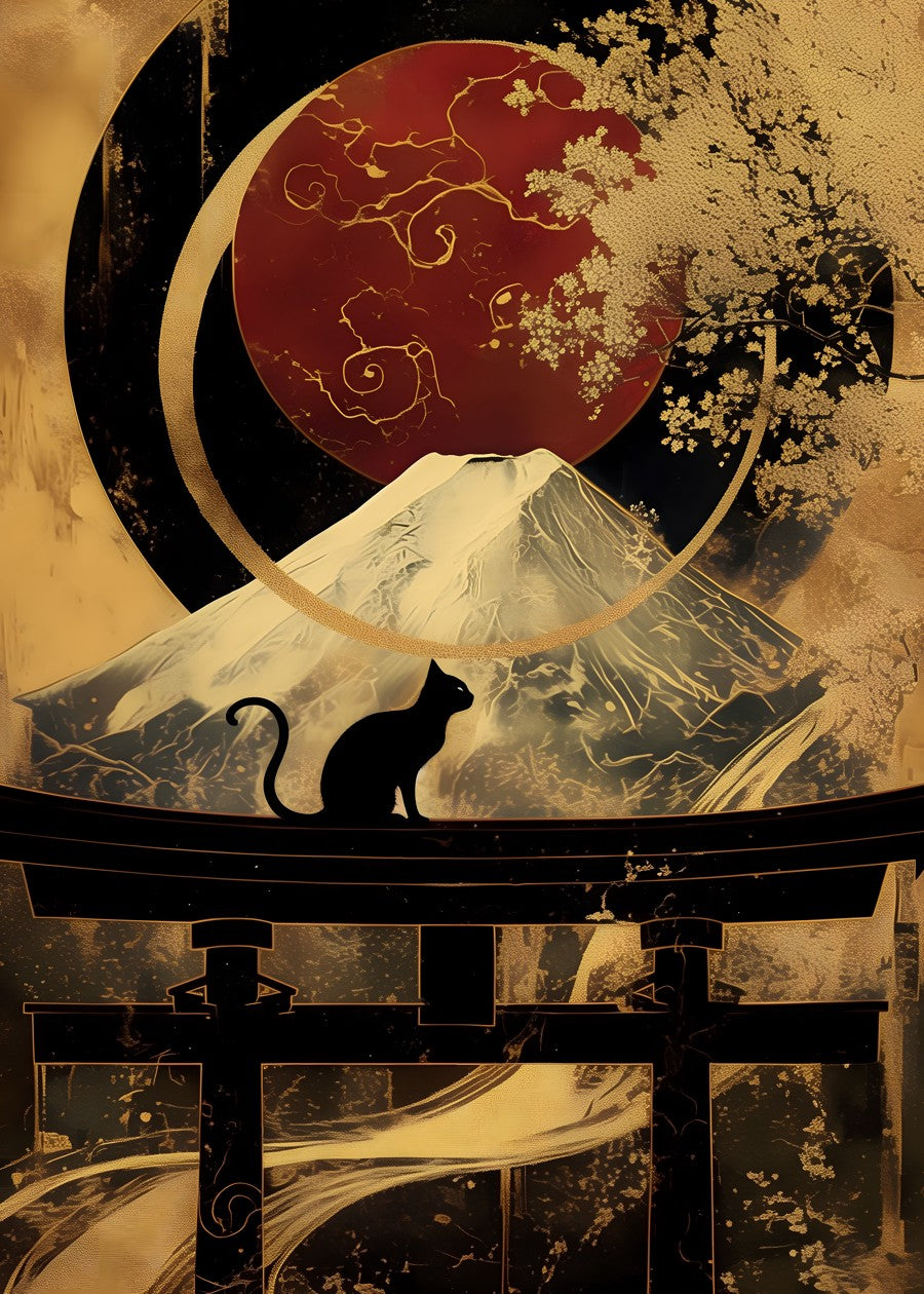 A silhouette cat sits under a red moon, with Mount Fuji in the background.