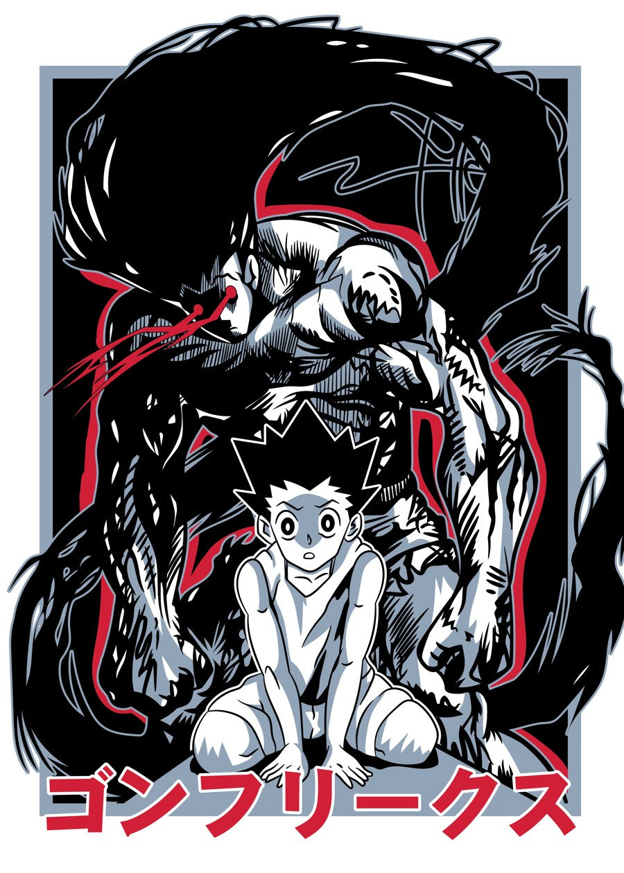 Powerful rage mode Gon from Hunter x Hunter. Dark, intense style with Japanese text. A dramatic and bold piece for true anime fans.