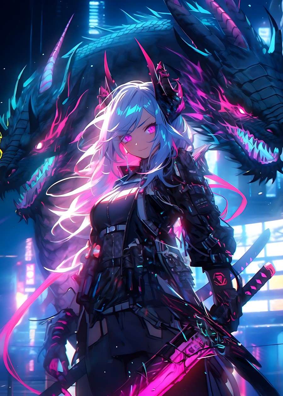 Anime Girl in cyberpunk outfit with twin dragon in the background.