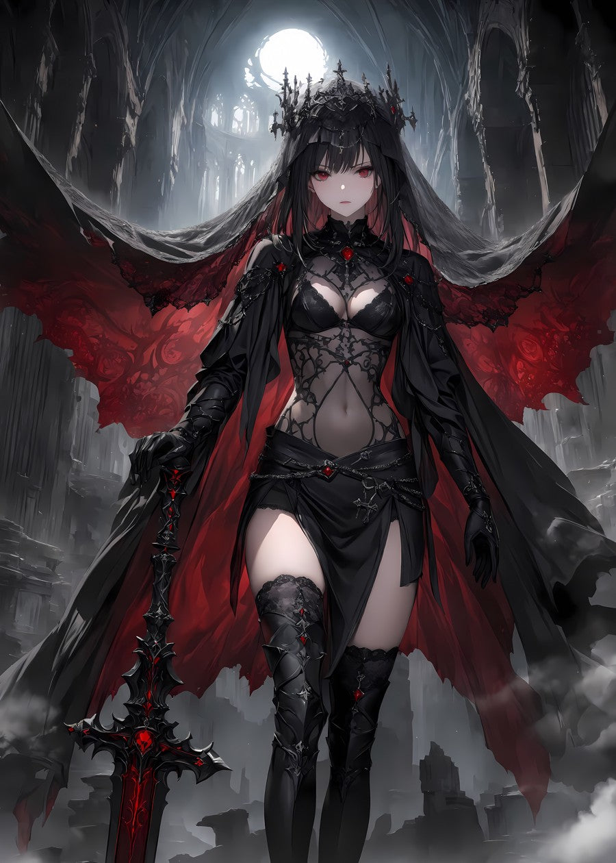 A dark sorceress stands amidst ruins, wielding a sinister blade.