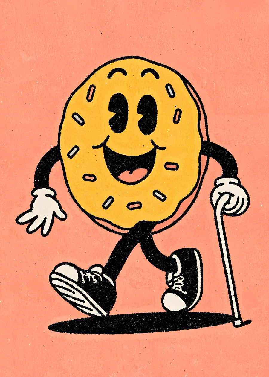 A cheerful donut with sprinkles and sneakers, strolling with a cane. Retro cartoon vibes and sweet personality!
