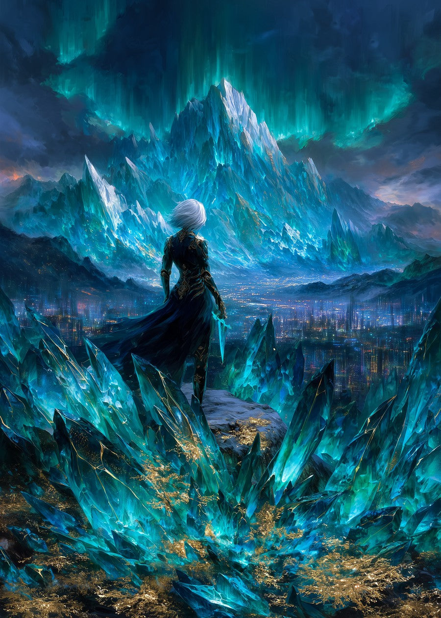A lone figure gazes upon a glowing, crystalline mountain landscape.