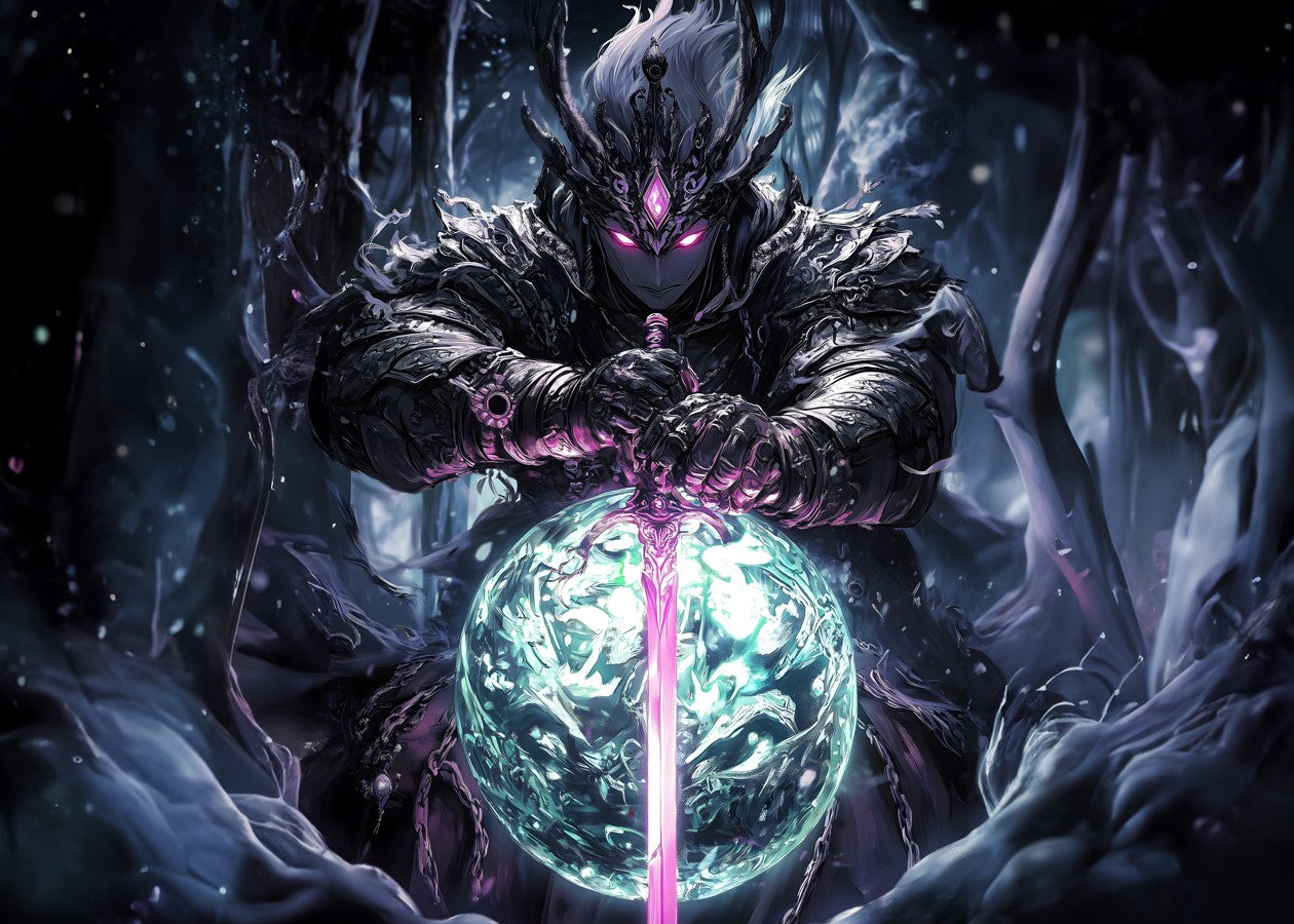 A mystical warrior wields a glowing sword, protecting the arcane orb.