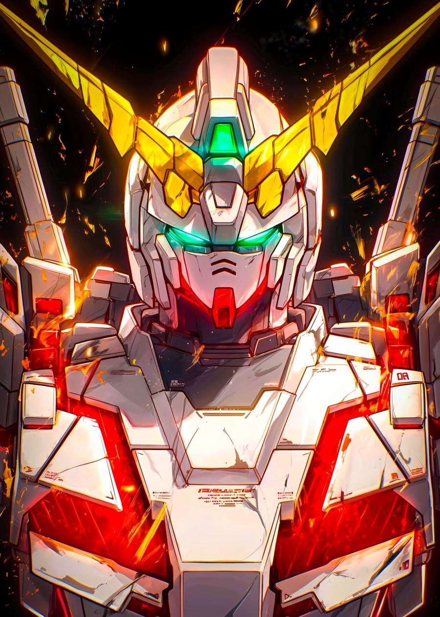 Powerful mecha fanart of Unicorn Gundam, glowing with fierce light and armored strength