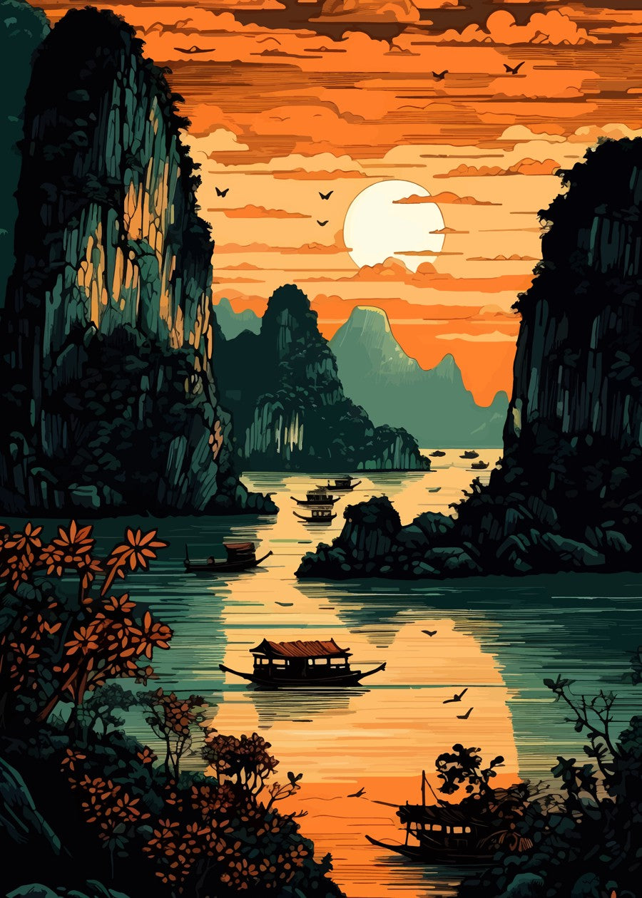 The image shows a stunning view of Halong Bay in Vietnam at sunset, reflecting the warm orange and yellow colors of the sky.
