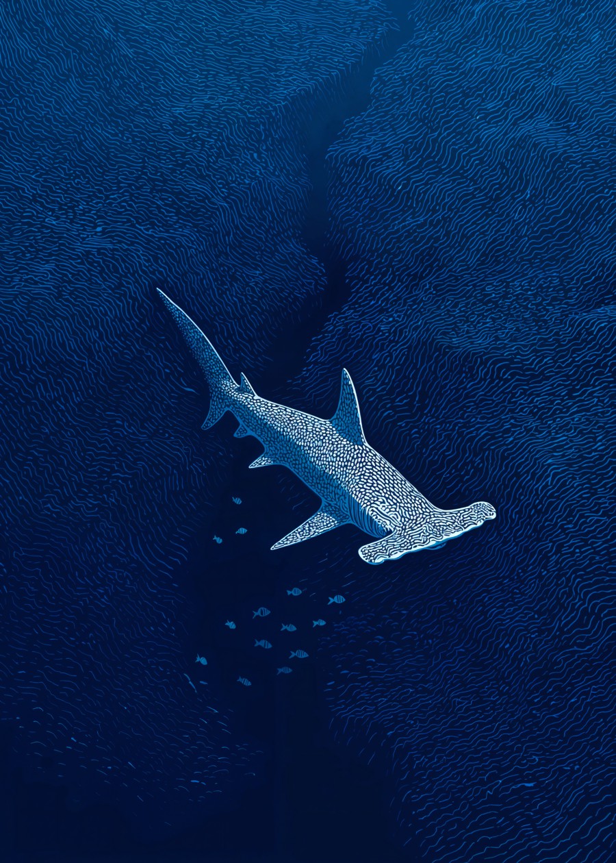A hammerhead shark drifts through the deep, its dotted silhouette cutting through textured blue depths and trailing fish.