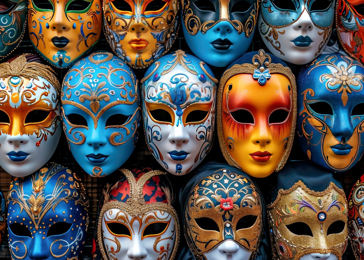 Vibrant Collection of Handcrafted Masquerade Masks Displayed at a Lively Carnival Market in Venice.