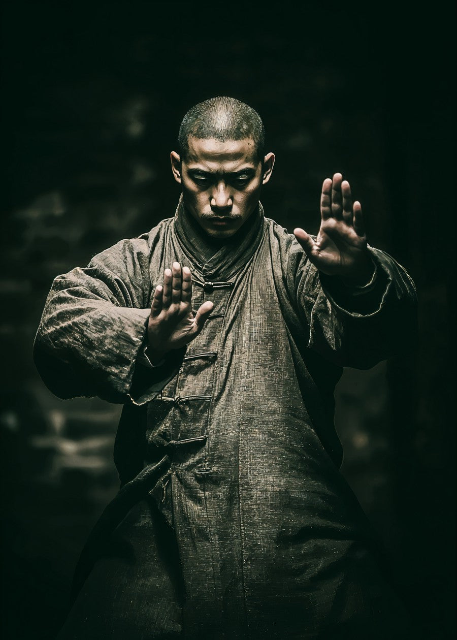 A warrior monk channels deep concentration through his poised hands, embodying calm control and disciplined spirit.