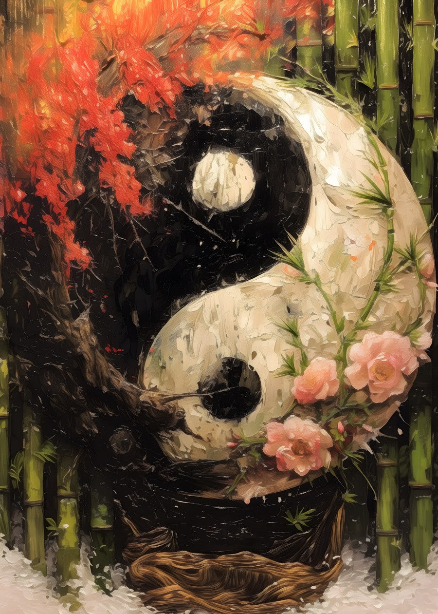 Yin and Yang entwined with bamboo, blossoms, and fiery leaves.