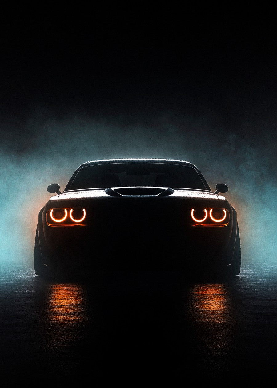 A menacing Dodge Challenger Hellcat, shrouded in a smoky, dark ambiance, its iconic circular orange headlights ablaze.