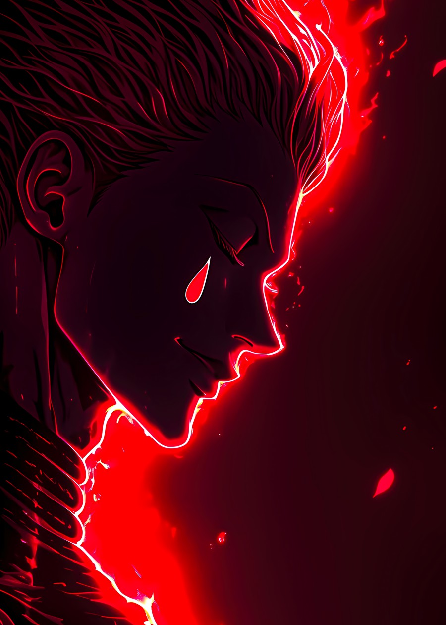 Dark glowing red portrait of Hisoka Morow from Hunter x Hunter, showing his menacing aura