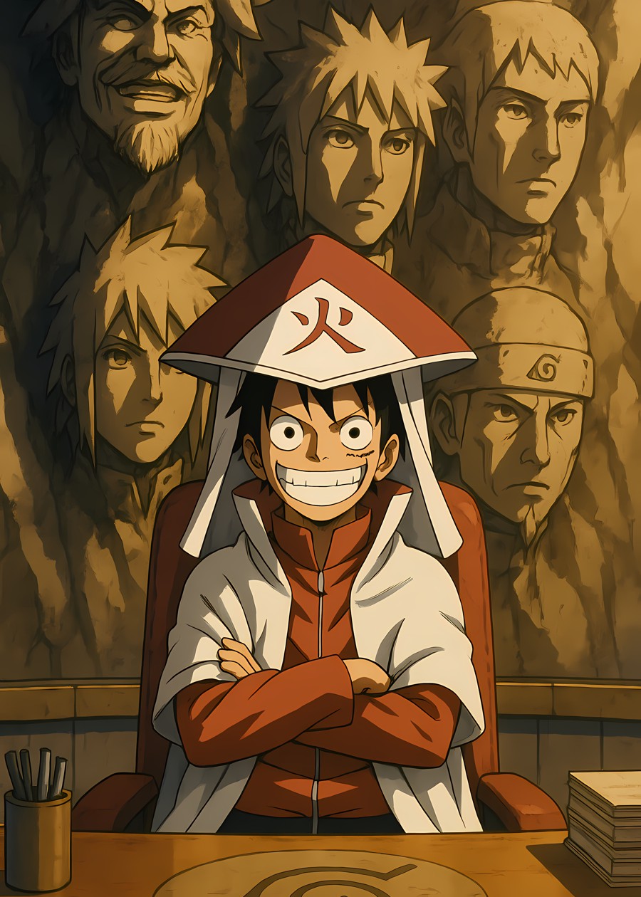 Luffy becomes Hokage, sitting at the famous desk with Roger’s face among the Hokage – a perfect anime crossover moment.
