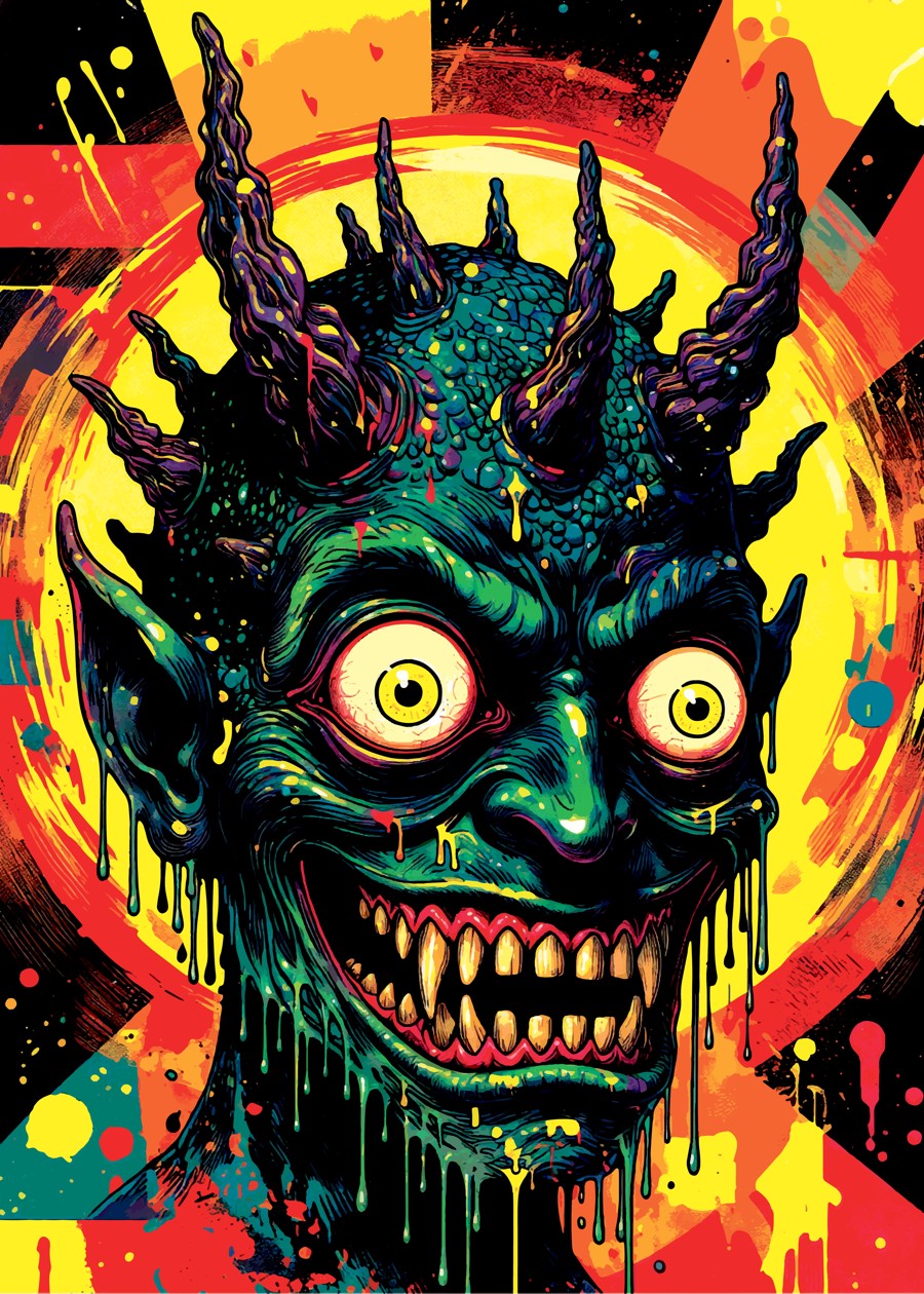 illustration of a monster that has several horns on its head, with pop art colors so that it doesn't seem too scary