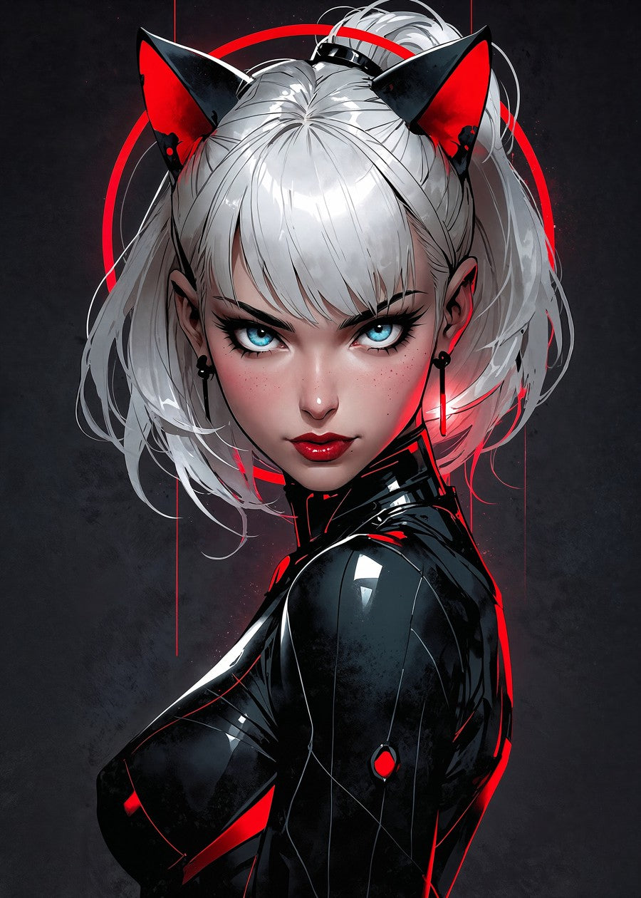 A close-up portrait of a young woman with white hair styled in a ponytail with black cat ears and a red glow. She has piercing blue eyes.