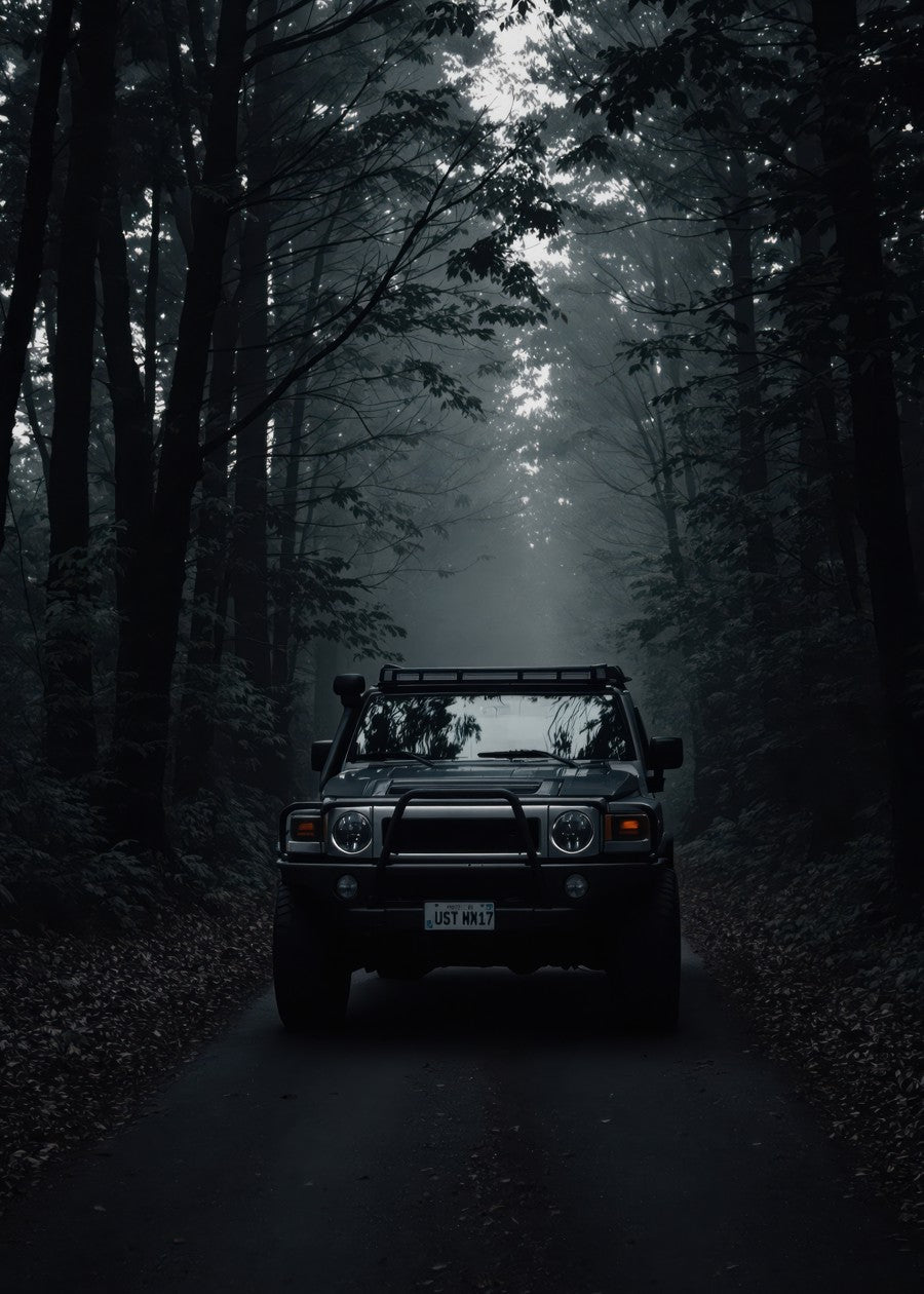 A dark-colored Hummer H2 drives down a misty, tree-lined road. The trees create a tunnel-like effect, and a patch of light breaks through th