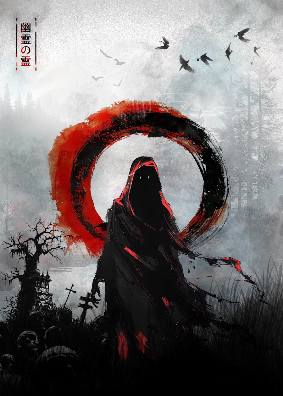 It's a spooky, dark spirit standing in a misty graveyard, with a cool red circle glowing right behind it.