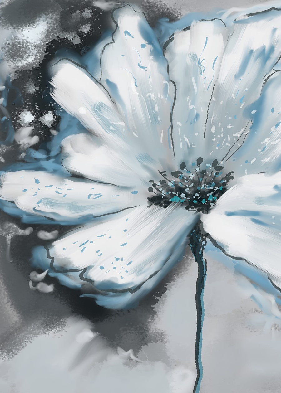 A dreamy white flower painted in icy blue tones—soft brushstrokes and splashes create a modern, ethereal floral impression.