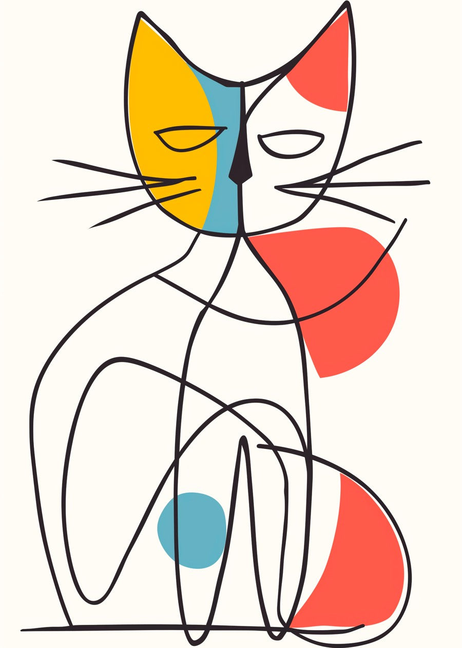 Abstract line art of a stylized cat with colourful facial halves and red accents.