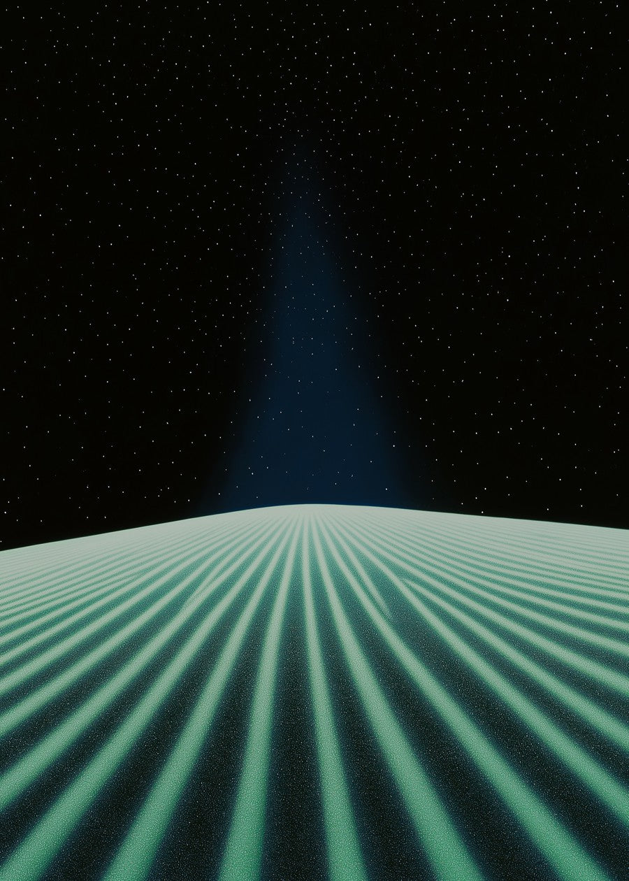 A minimalist depiction of an infinite, textured green light grid stretching across a planet surface under a deep black, star-filled sky.