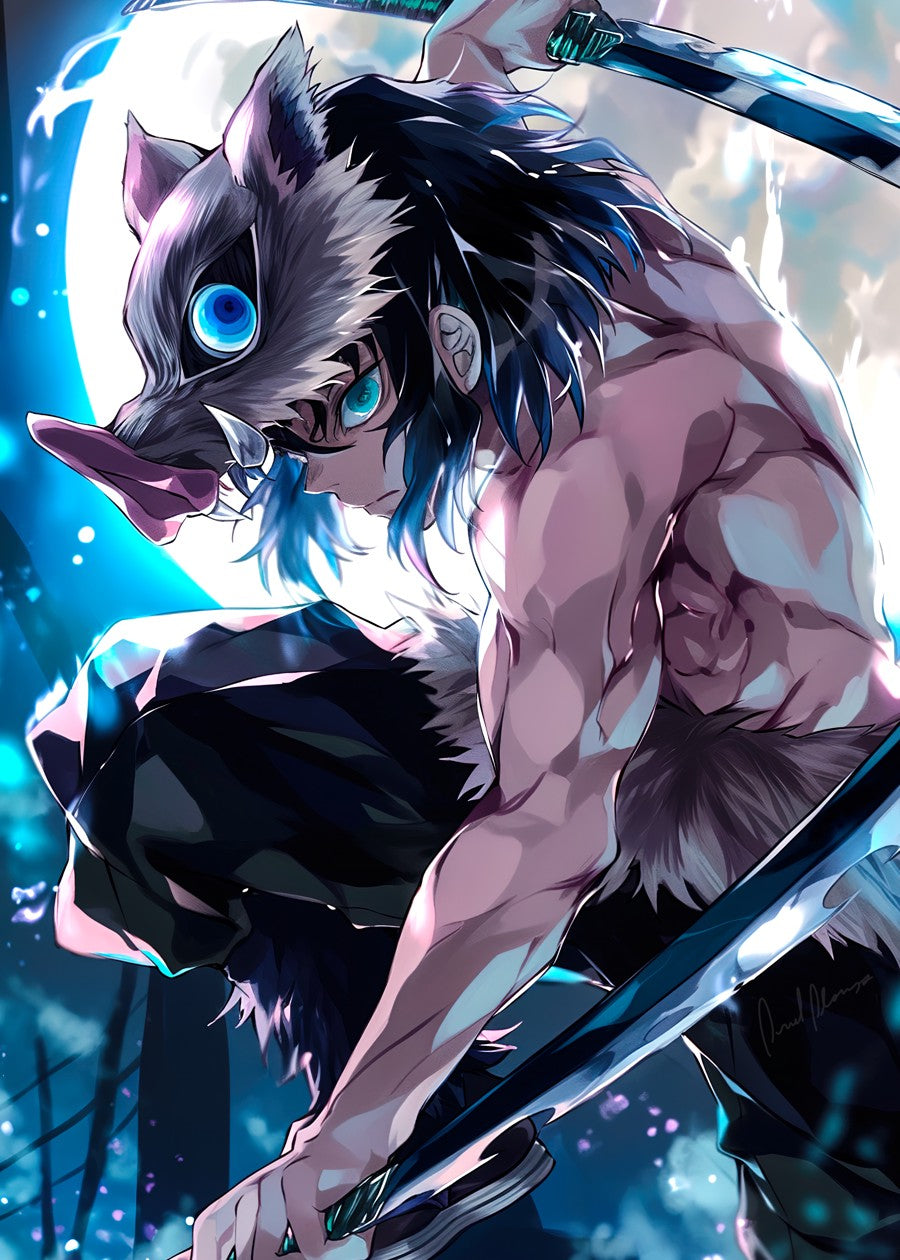 The subject is a muscular character with a boar-like mask, wielding a weapon, and surrounded by dynamic, fiery effects.