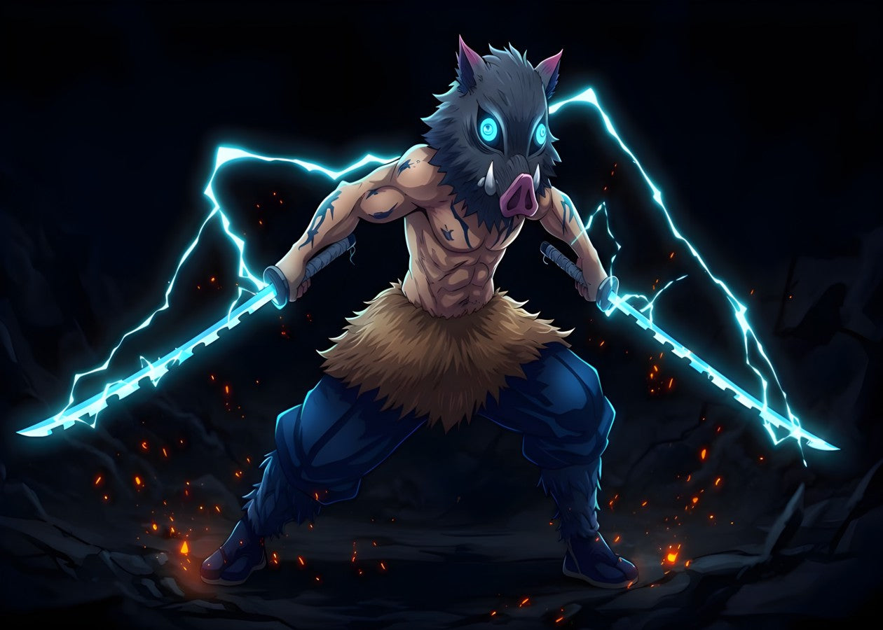 powerful warrior with a boar mask stands poised for battle, wielding dual swords crackling with blue lightning.