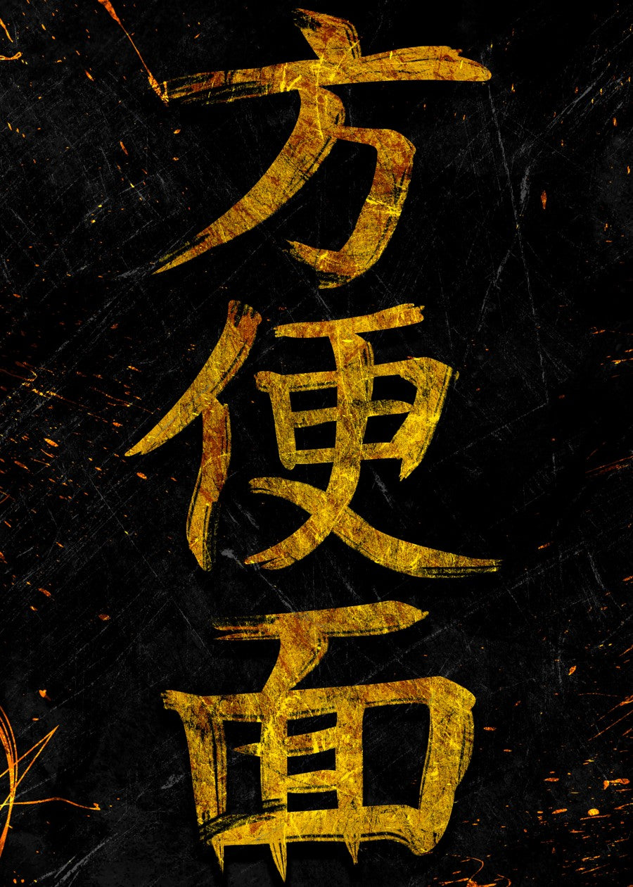 Bold gold brushstrokes form the Chinese characters for "Instant Noodles" on a rugged black background.