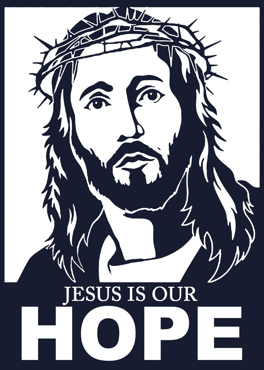 Bold monochromatic artwork portraying Jesus crowned with thorns above the phrase “Jesus is Our Hope,” symbolizing faith and encouragement.