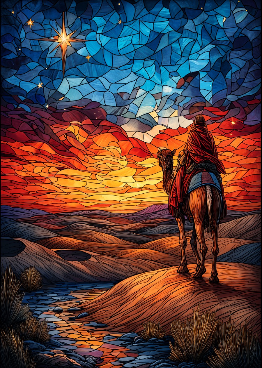 A lone traveler and their camel cross glowing desert dunes under a star-filled sky in this breathtaking stained-glass inspired scene.