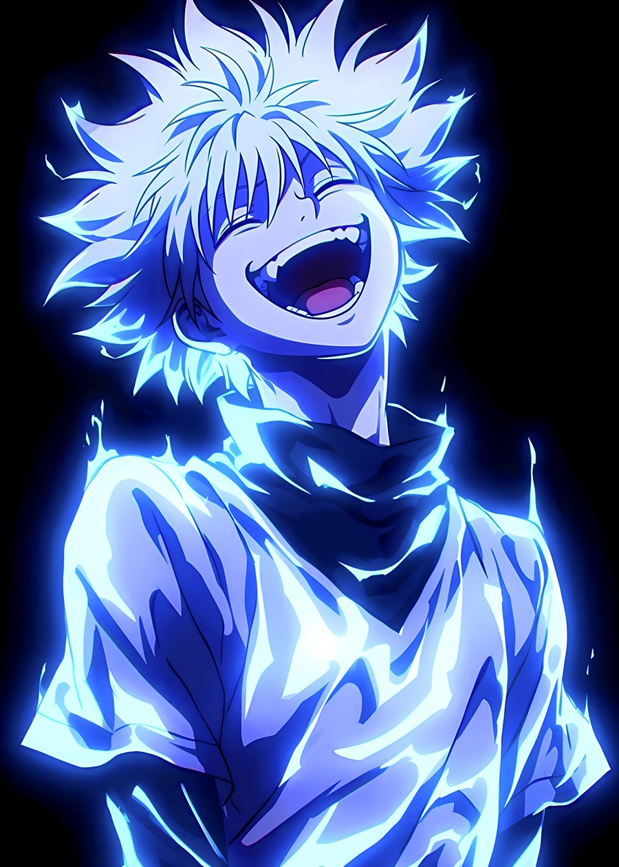 Killua’s rare, carefree laugh breaks the silence—pure happiness shining through the tough assassin’s usual calm and cold exterior