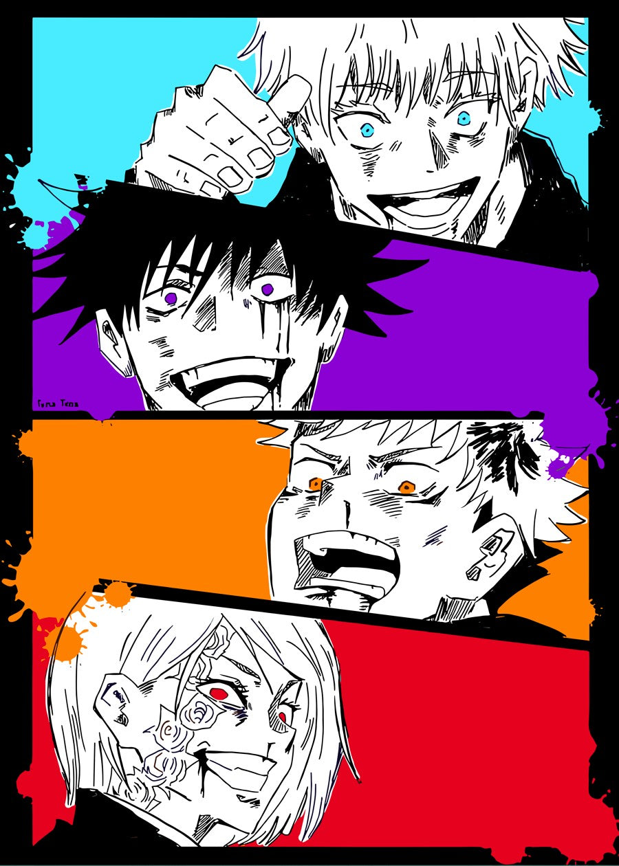 This pop-style ink illustration features four major characters from "Jujutsu Kaisen" in colorful panels with splattered backgrounds.