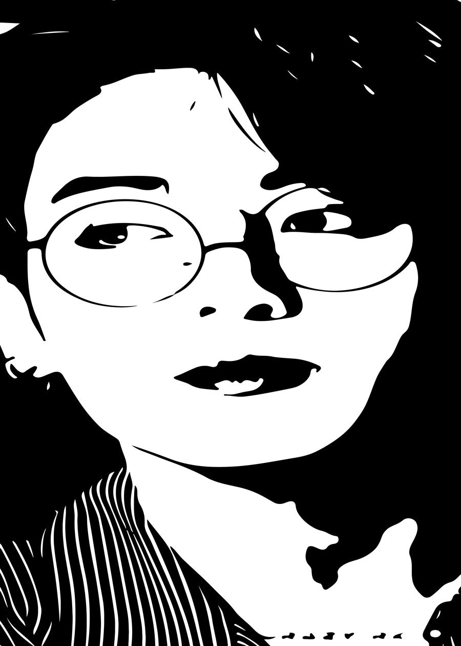 Striking portrait illustration rendered in black and white, emphasizing dramatic contrast and expressive line work.