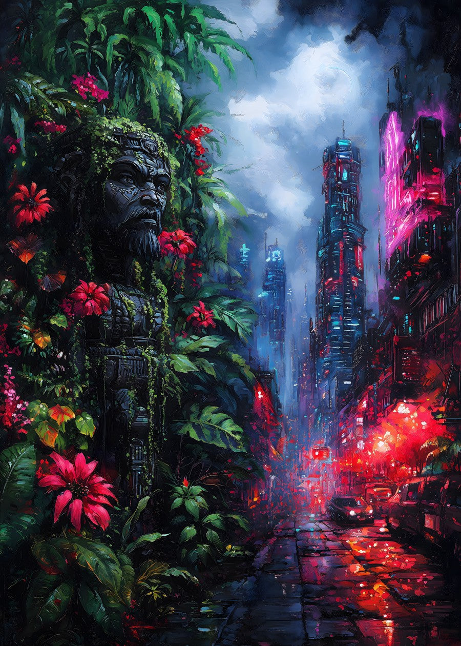 A mystical jungle blends into a vibrant, neon-lit cityscape under a moonlit sky.