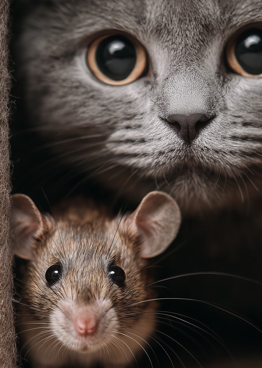 A close-up shot of a small mouse peeking out, with a large, observant cat's face looming in the background.