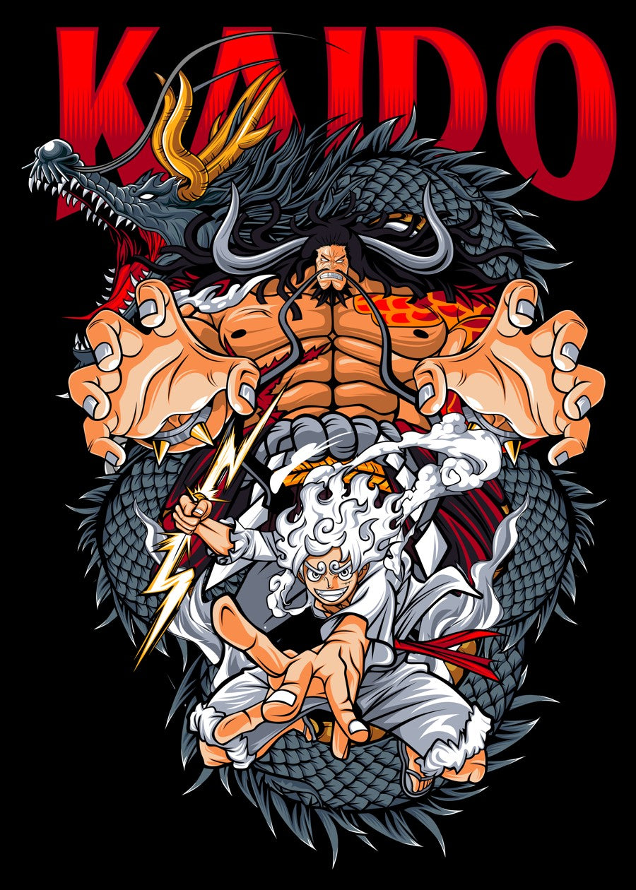 A thunderous clash between Kaido and Gear 5 Luffy, full of energy and epic scale from One Piece.