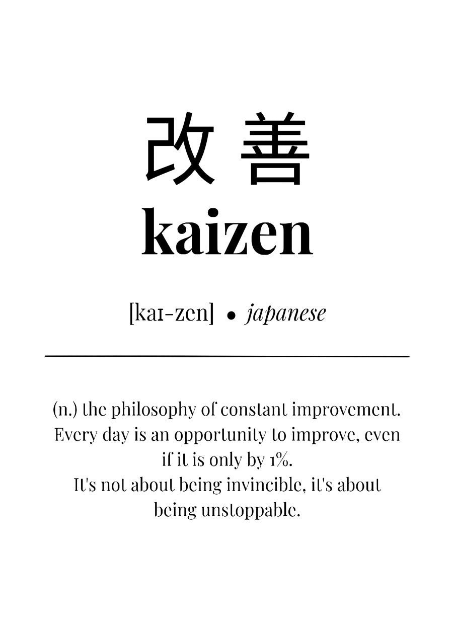 Featuring the Japanese characters for 'Kaizen,' this image defines the term as the philosophy of daily, continuous improvement.