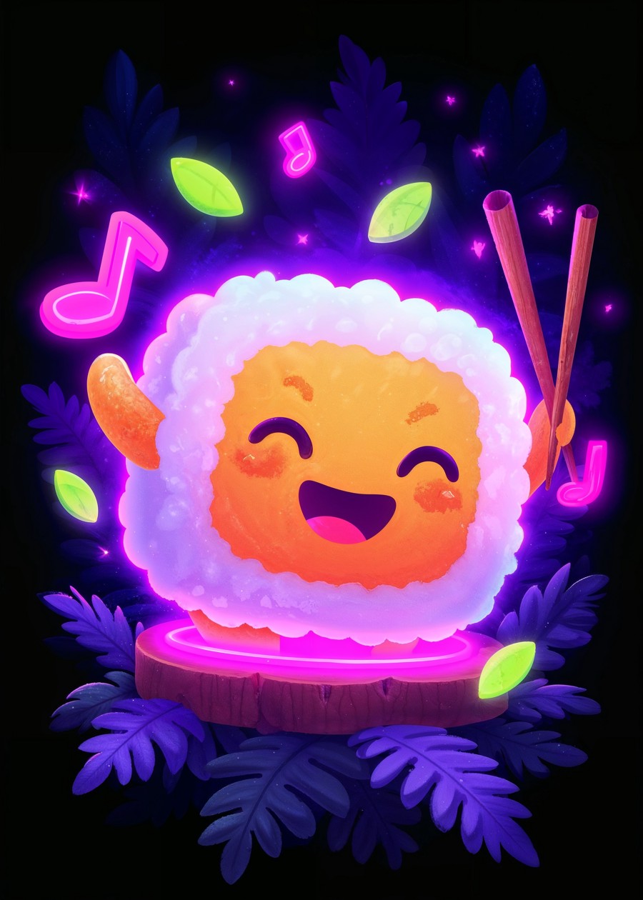 Adorable sushi lumineux avec un sourire joyeux, des baguettes et des notes de musique dans un style kawaii et vibrant.
