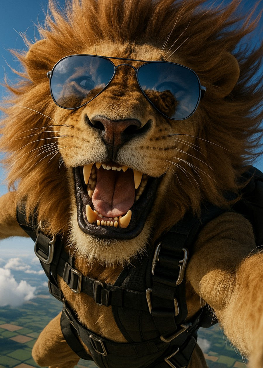 A cool lion takes a skydiving selfie! He's wearing aviator sunglasses and a harness, soaring high above the fields. Adventure king!