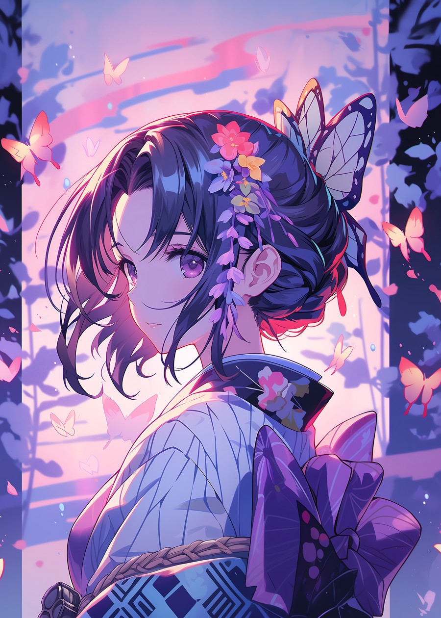 A graceful girl in kimono, surrounded by glowing butterflies, radiates mystery and elegance under a twilight sky.