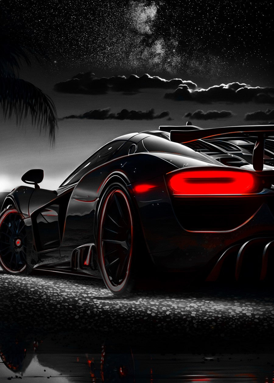 A sleek Koenigsegg Agera RS, with striking red taillights, sits under a star-filled night sky, hinting at power and mystery.