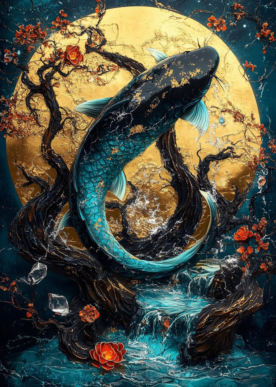 A vibrant koi fish leaps toward a golden moon, embraced by cherry blossoms.
