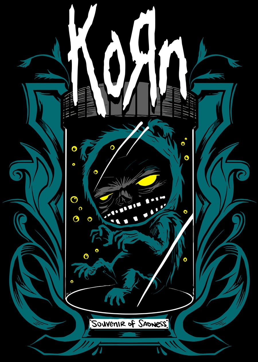 A dark, striking graphic for Korn, showcasing a sinister hooded creature floating inside a glass jar surrounded by teal ornamental designs.