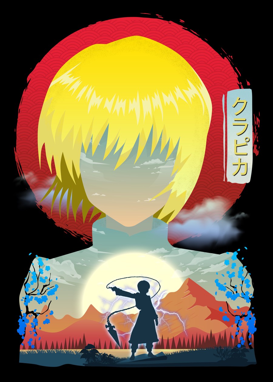 Kurapika is a fictional character from Yoshihiro Togashi's manga series Hunter × Hunter. Kurapika is the last remaining member of the Kurta Clan who wishes to become a Hunter in order to avenge his clan and recover their scarlet-glowing eyes that were plucked from their corpses by a band of thieves known as the Phantom Troupe. In the series's first story arc, he befriends the protagonist and Hunter participant Gon Freecss after having a fight with Leorio Paradinight.