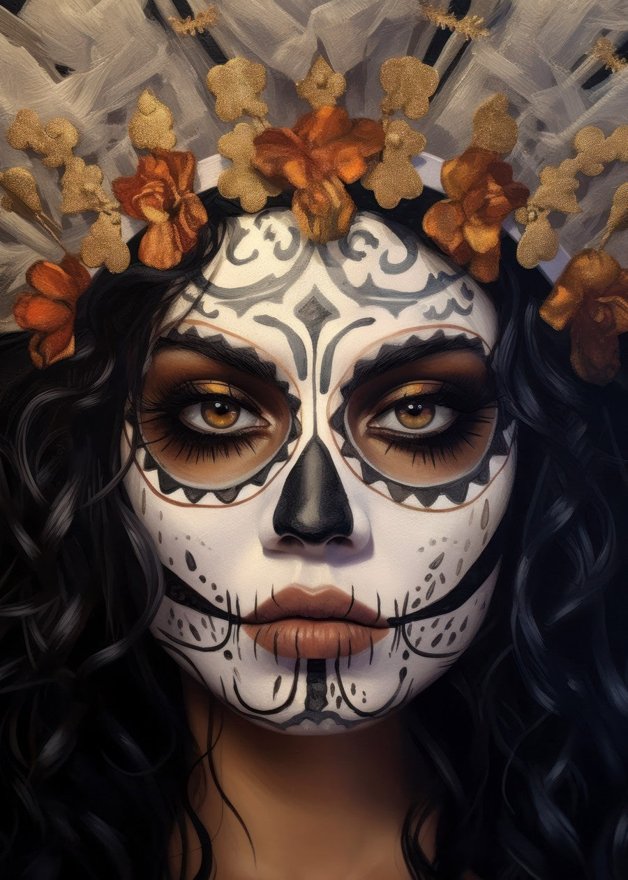 An ethereal fusion of beauty and tradition: a closeup capture of a stunning woman adorned with La Catrina makeup. Mesmerizing artistry.