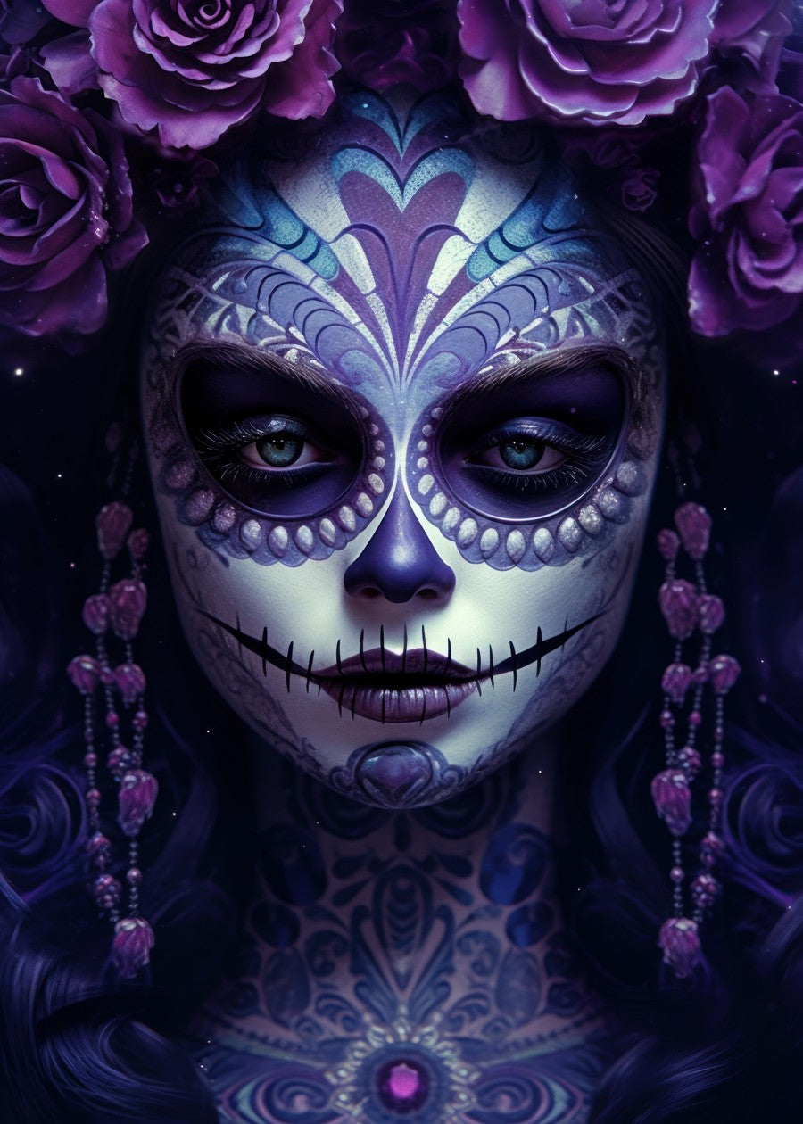 A closeup journey into Mexican folklore: vibrant colors and intricate details bring La Catrina to life, honoring the Day of the Dead.