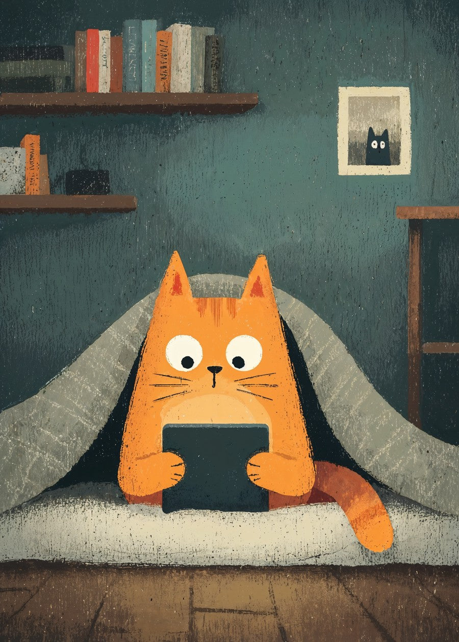 Snuggled under a blanket, this wide-eyed chonk cat is caught doomscrolling at night with a glowing tablet in paw.